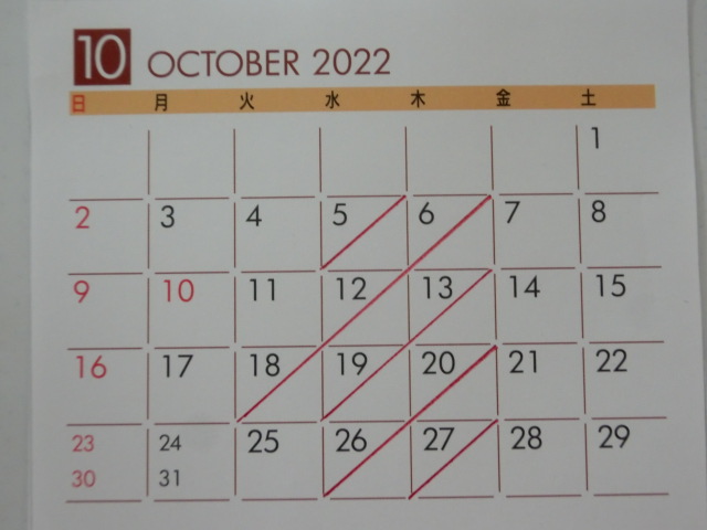 10月の 店休日